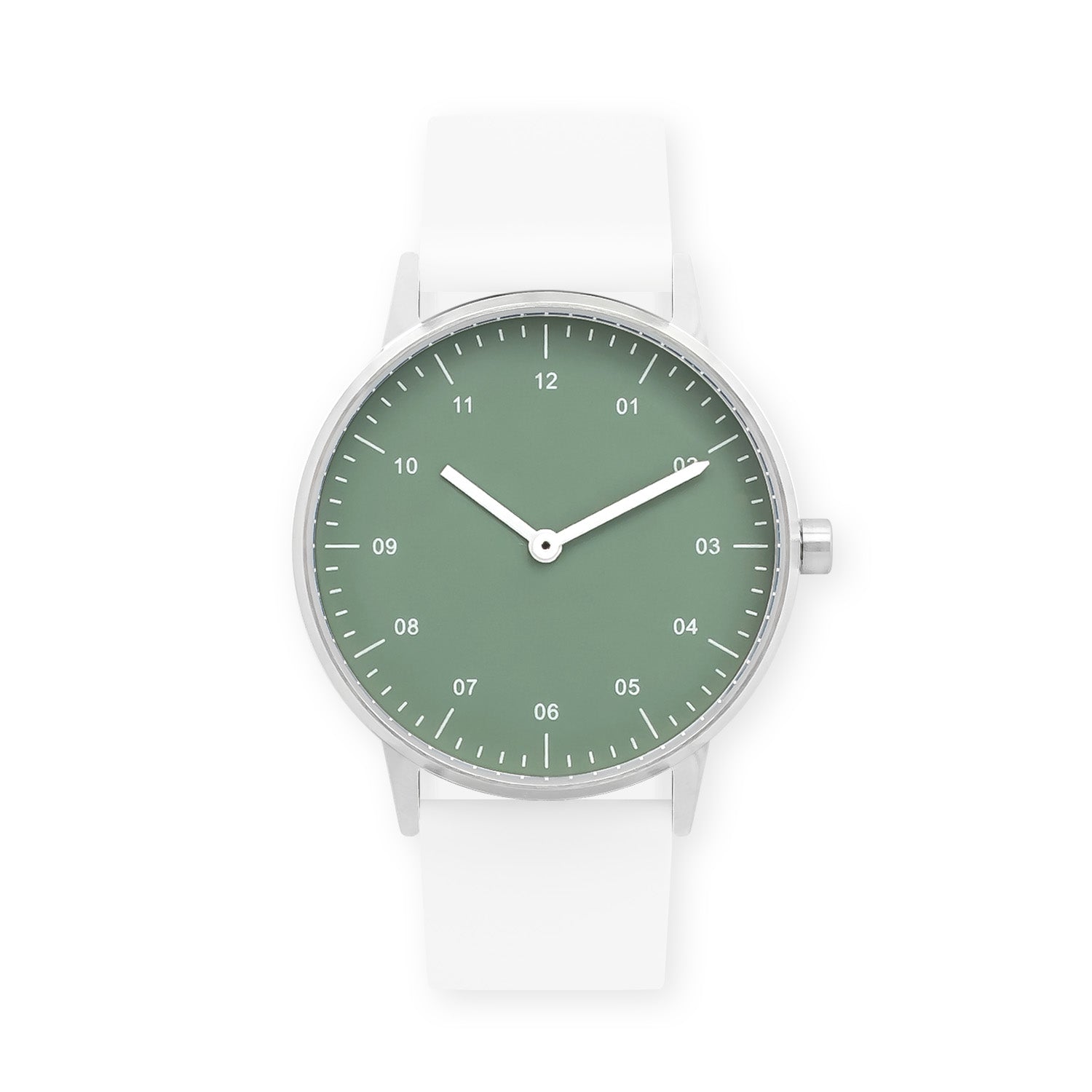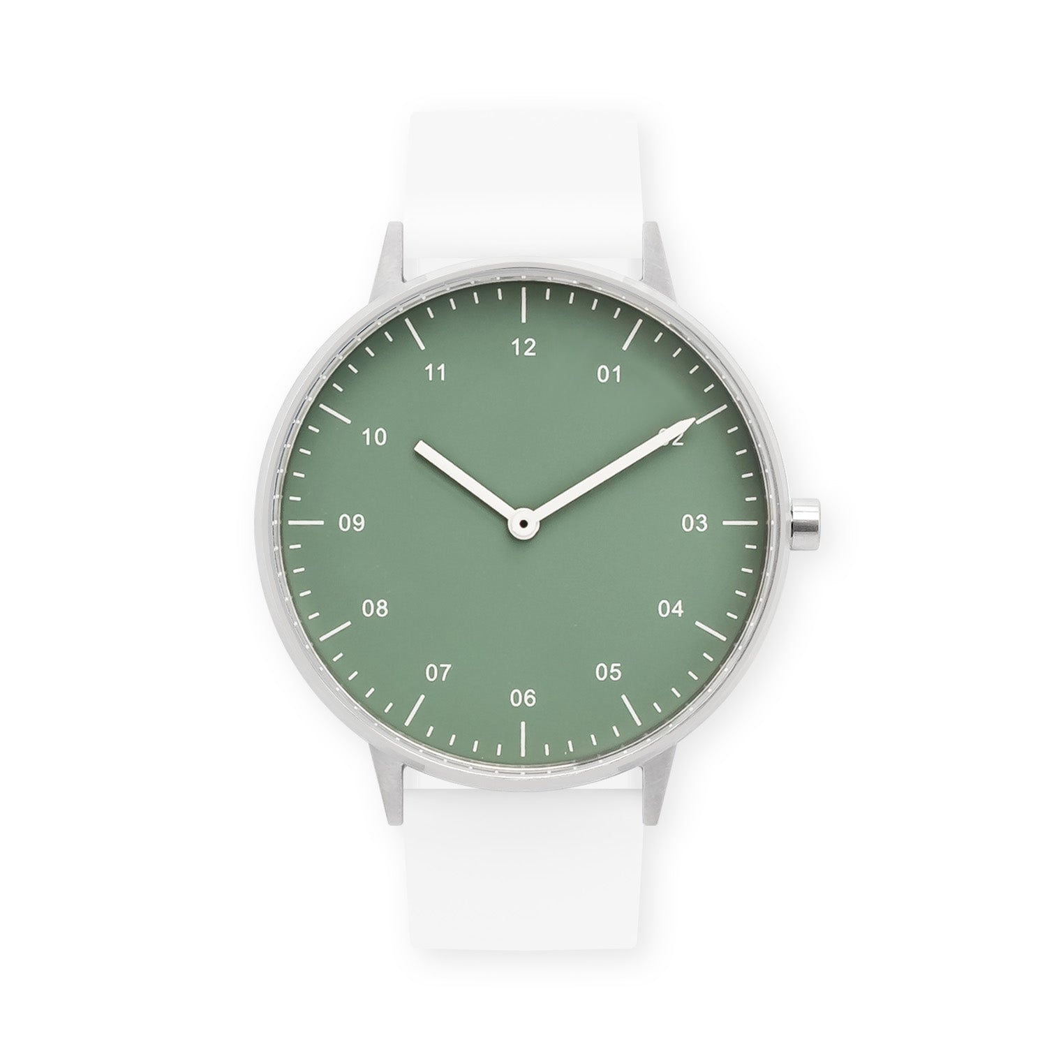 B40 Watch, Silver Case, Green Dial, Rubber Strap - White